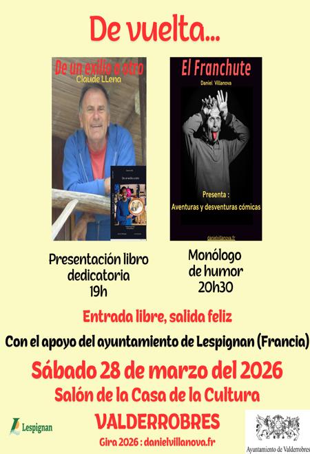 El próximo sábado 28 de marzo de 2026, el Salón de la Casa de la Cultura de Valderrobres será escenario de una velada cultural muy especial, organizada en el marco del hermanamiento firmado el pasado año entre nuestro municipio y la localidad francesa de Lespignan.