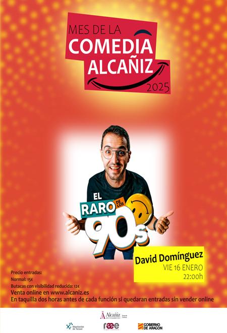 David Domínguez es un tío feliz (pero no feliz porque sea feliz, sino porque se entrena todos los días para serlo). ‘El raro de los 90’ es un espectáculo de humor en el que David Domínguez da un repaso en tono irónico, simpático y gamberro a sus vivencias en la maravillosa década de los 90. Con ese don que lo caracteriza para hacer reír cuenta situaciones irónicas y divertidas. Un espectáculo donde saca a la luz sus mejores textos que lleva escribiendo y probando 15 años y ahora se hacen realidad en este espectáculo. ¿Todavía no conoces a Vicent? ¿Y a las ‘tribus urbanas’ de los 90? ¿Conoces cómo se ligaba entonces? Descubre todos estos personajes y disfruta de un gran espectáculo de comedia. David Domínguez es un cómico hecho a sí mismo en el mundo de los monólogos y el humor. Un día, por casualidad, alguien le presentó a un concurso de monólogos que ganó de calle aún sin saber muy bien cómo. Desde entonces, abandonó todo a lo que se estaba haciendo para centrarse en el arte que más feliz le hace a él y a los demás: el arte de hacer reír.
