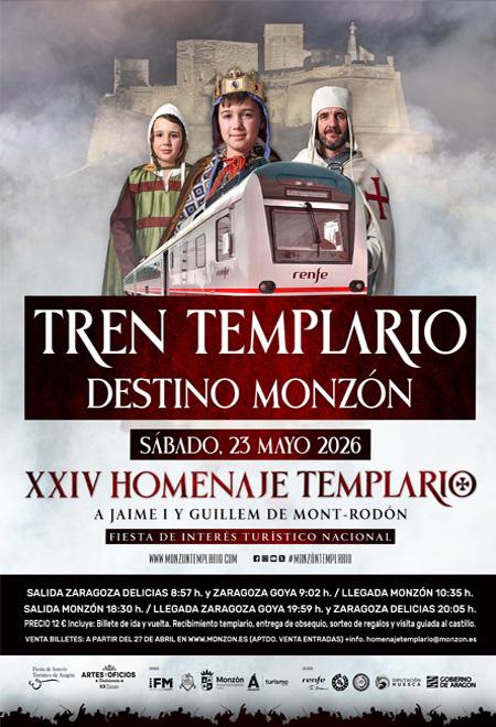 El TREN TEMPLARIO. DESTINO MONZÓN (23 de mayo de 2026) será un viaje apasionante para conocer el pasado templario de Monzón y los acontecimientos que hicieron que el rey Jaime I viviera durante tres años en el castillo de Monzón bajo la tutela del maestre de la Orden del Temple, Guillem de Mont-rodón. El precio del billete es de 12 € ida y vuelta e incluye: Billete de ida y vuelta Zaragoza Monzón, recibimiento templario al llegar a la estación de Monzón, entrega de obsequio recuerdo, sorteo de regalos y visita teatralizada al castillo de Monzón a las 16 h.