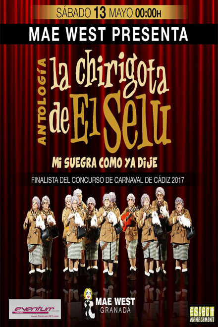 En Mayo la Mae West Granada nos trae la Chirigota finalista del concurso carnaval de Cadiz 2017 una de las chirigotas más famosas la Chirigota del Selu, recuperando todos sus éxitos.