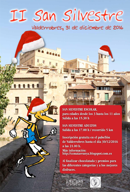 II carrera San Silvestre en Valderrobres para acabar el año 2016 haciendo deporte. Esta carrera tendrá lugar el día 31 de Diciembre y se dividirá en dos carreras. Por un lado los más pequeños podrán correr la San Silvestre Escolar donde correrán niños de 3 hasta 11 años y cuya salida se realizará a las 15:30. Para las demás personas que quieran participar y superen los 11 años tendrá lugar la San Silvestre Adultos. El pistoletazo de salida de esta última carrera será a las 17:00 y la carrera tendrá un recorrido de 5km. A la carrera podrás venir disfrazado. Al finalizar las carreras se harán una entrega de premios para los ganadores de las diferentes categorías y a los mejores disfraces. Además, se realizará una chocolatada para combatir el frío. Inscripción gratuita en el pabellón de Valderrobres hasta el día 30/12/2015 a las 21:00 horas.